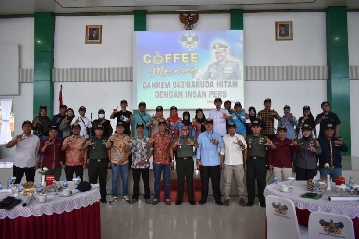 TOPIKINDONESIA.ID – Korem 043/Gatam menggelar Coffee Morning dengan Insan Pers di Provinsi Lampung untuk menguatkan hubungan dan ikatan batin TNI dan Pers dalam rangka turut serta membangun Provinsi Lampung menjadi lebih baik, di Aula Ahmad Yani Makorem 043/Gatam, Rabu (15/2/2023).