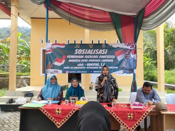 “Pancasila merupakan Ideologi bangsa, sebagai pedoman bagi masyarakat Indonesia dalam menjalankan kehidupannya. Nilai-nilai, yang terkandung dalam kelima asas Pancasila menjadi landasan masyarakat dalam bersosialisasi, kehidupan beragama, hak asasi manusia, dan bekerja sama,” Kata Ketua Fraksi PKB DPRD Lampung, Hanifah, saat menggelar sosialisasi Pembinaan Ideologi Pancasila (PIP), dihadapan masyarakat Desa Khepong Jaya Kecamatan Padang Cermin, Pesawaran. Sabtu (18/2/2023).