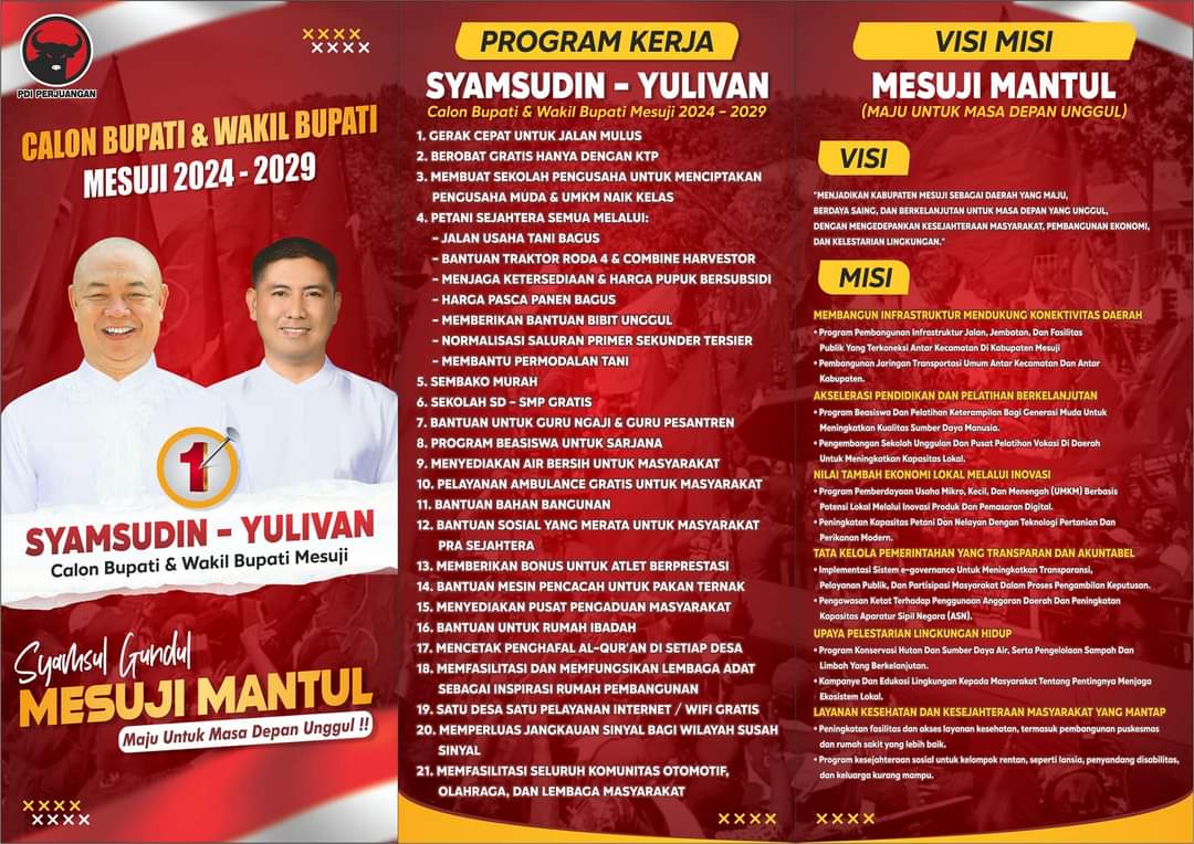Selain Program di Atas Pasangan Syamsudin dan A Yulivan (Nomor Urut 1) Yang di Usung Oleh Partai PDI Perjuangan itu pun Memiliki Visi Dan Misi Untuk Kemajuan Kabupaten Mesuji Kedepanya.