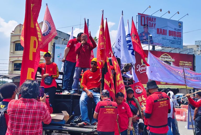 TOPIKINDONESIA.ID – Ratusan massa yang tergabung dalam Aliansi Perjuangan Rakyat Lampung turun ke jalan memperingati Hari Buruh Internasional (May Day) di Bundaran Tugu Adipura pada Kamis (1/52025).