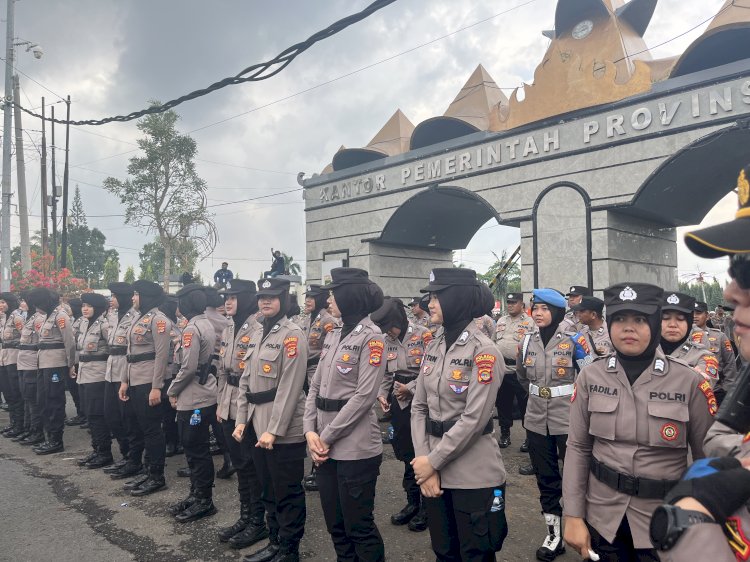 Polda Lampung menurunkan 1.247 personel. Dua barisan polwan berdiri sebagai negosiator, sementara barisan polisi laki-laki disiagakan di belakangnya.